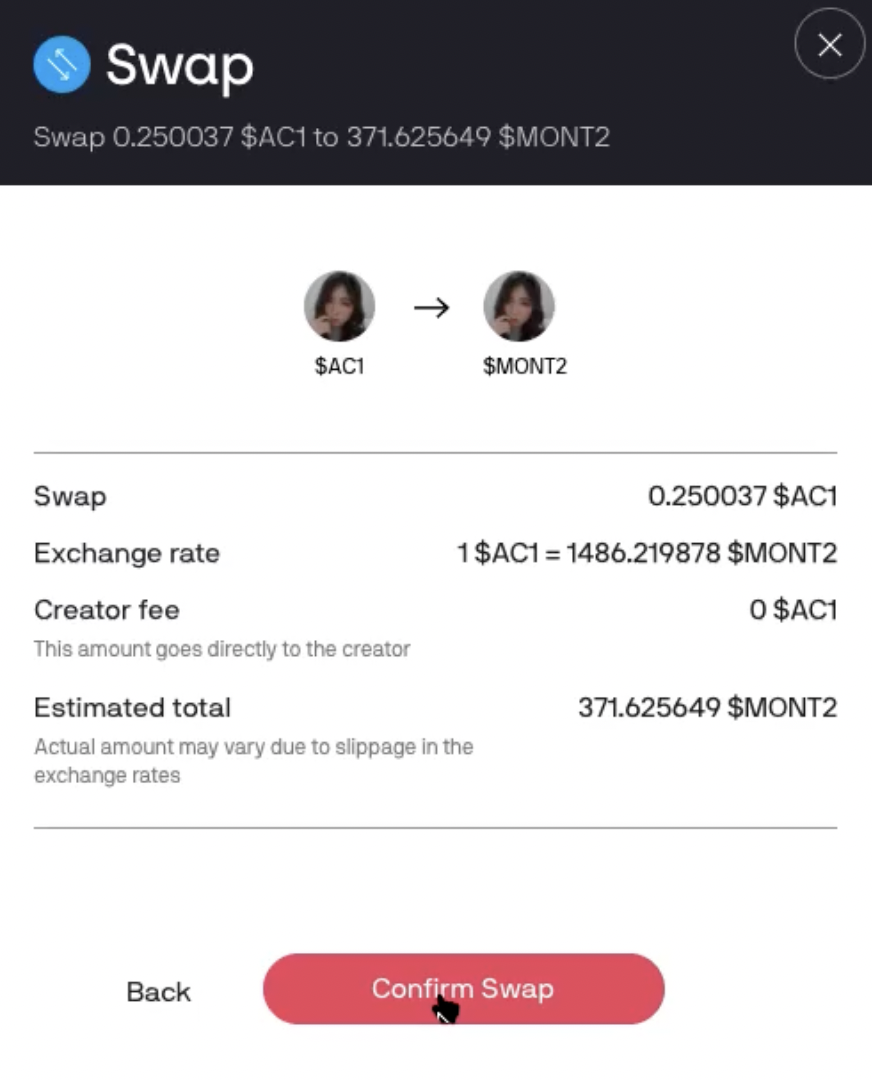 8. Click Continue to see the swap summary and Creator Fee that will be deducted from the swap (the Creator Fee will be paid to the Creator you are swapping from).